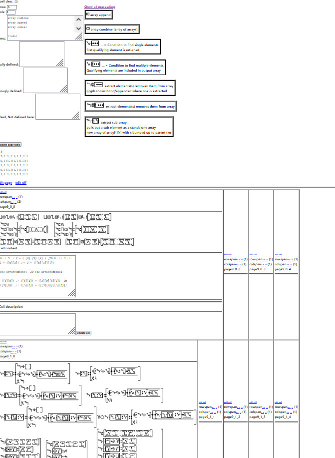 finish updating subarray ops it was split into single result and array result needs extra defs and need to go through other pages to update old defs that are now wrong update array conditional def to reflect the new updated version the simple glyph now only extracts a single element, and the array version returns all matches define array extract multi element matches returns array id reference return only the element (not encased as an array for one element) condition extracts all that match discard the return to just 'delete' from array **add clearer examples here of appending to loop return to give an array result from a loop **could do so many more array ops, but drawing the line for now **add count/sum/avg onto array extract for quick ops(just add small icon prefix to the box protrusion). that way you can ask "how many meet this conditon" etc.. | ||||||||||||||||||||||||||||||||||||||||||||||